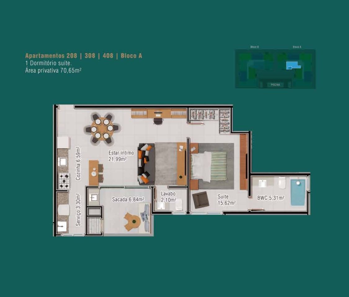 Apartamento de 2 dormitórios sendo 1 suíte amplos e aconchegantes, sala e cozinha integradas, infraestrutura para água quente, infraestrutura ar condicionado, sacada com churrasqueira e 1 banheiro social.