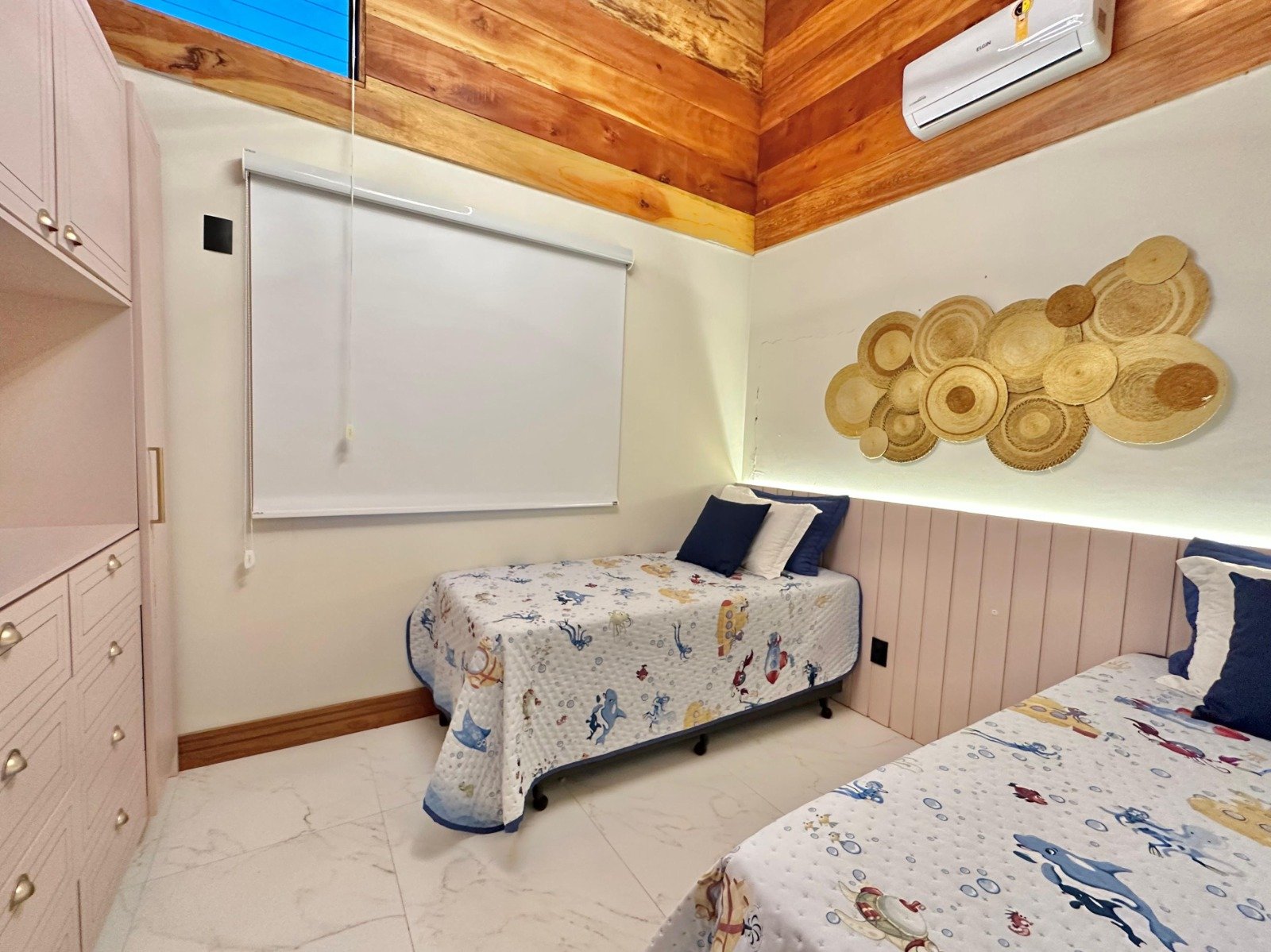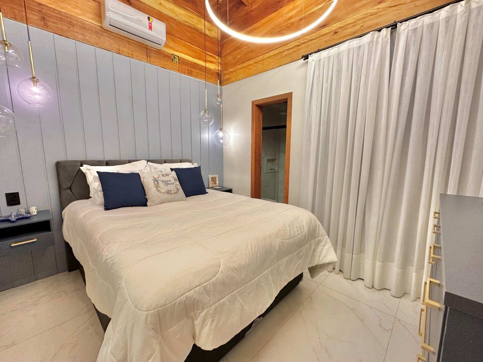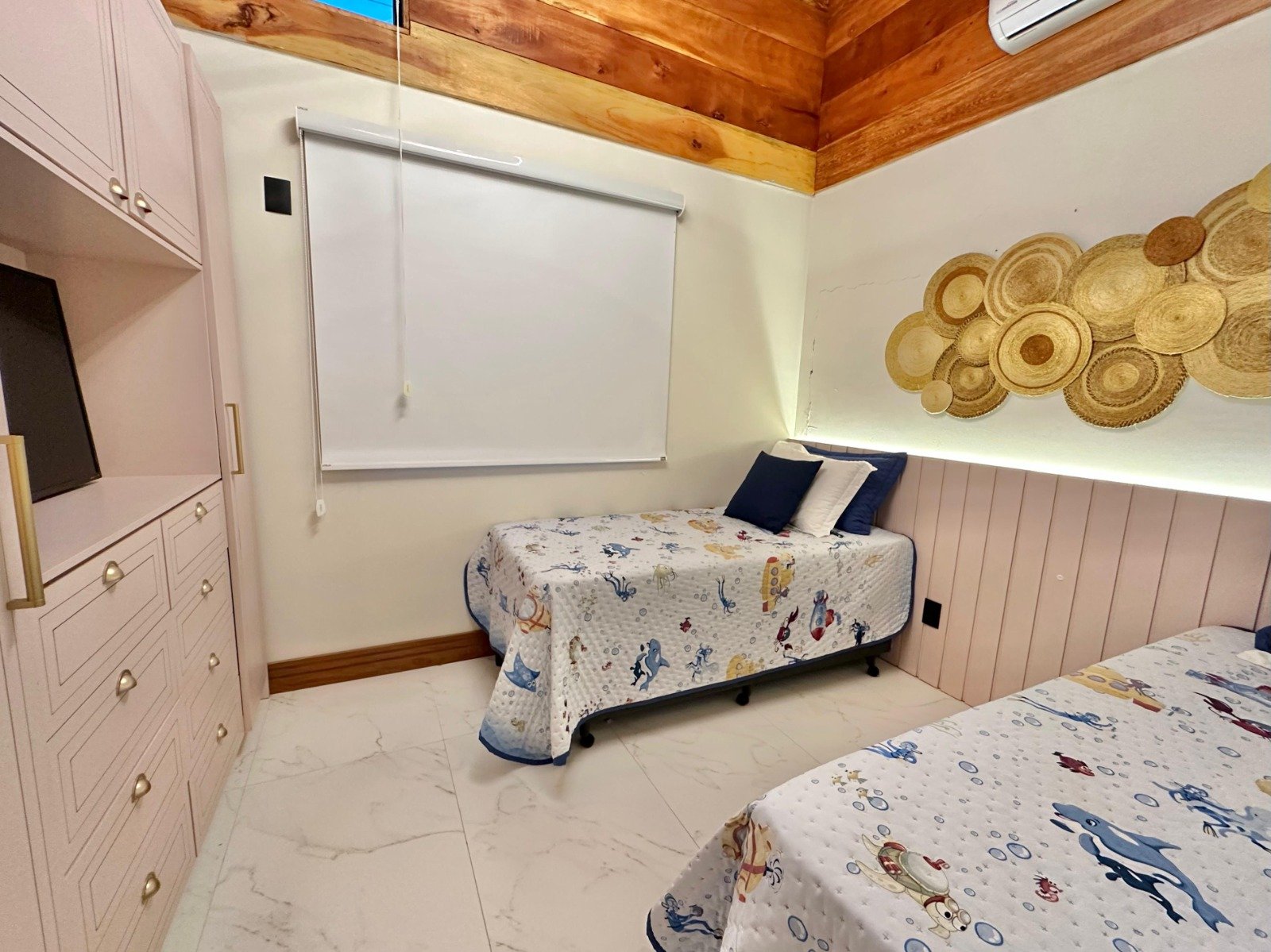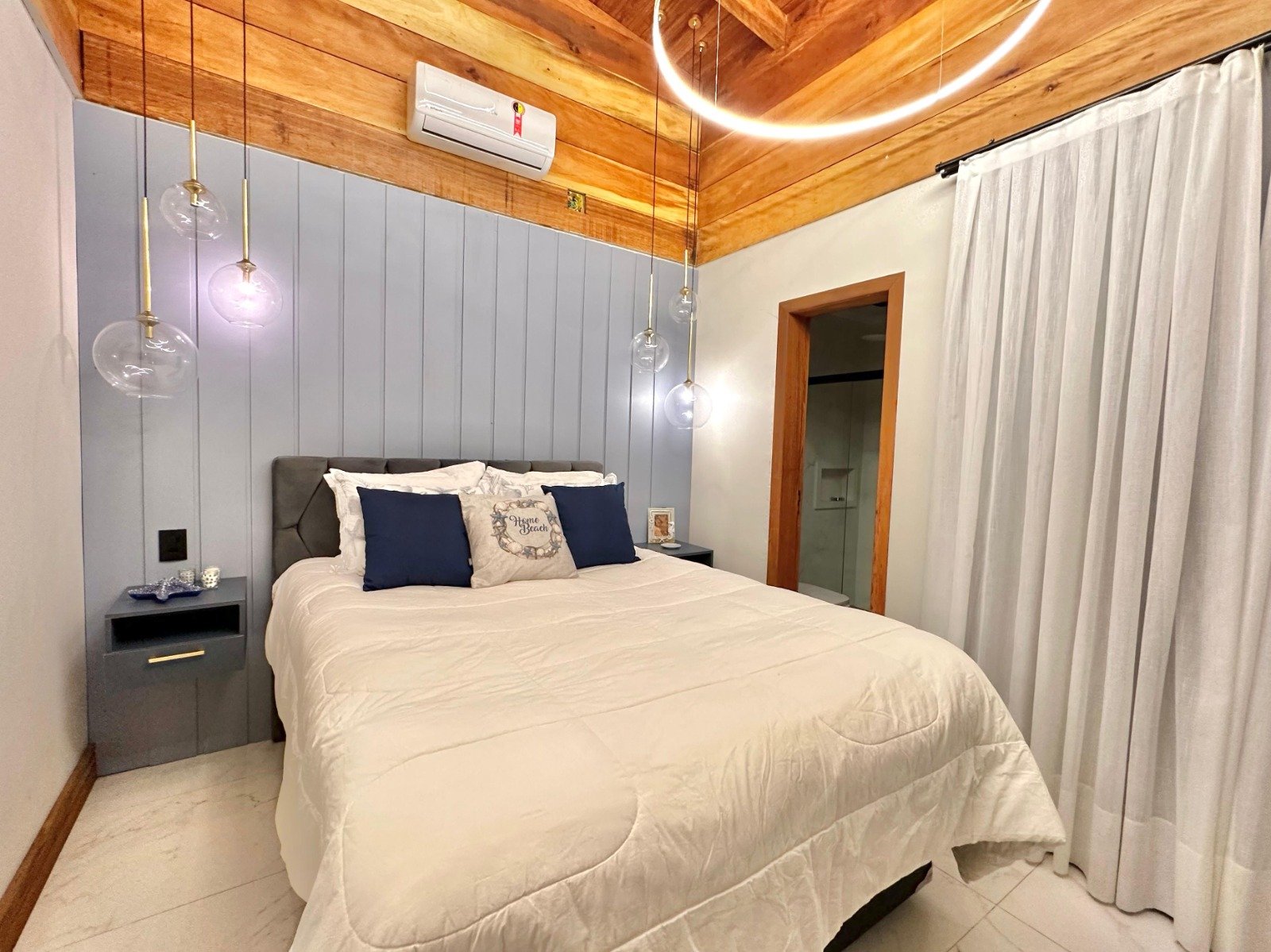 Temos 3 quartos confortáveis, cada um projetado para garantir uma noite de sono tranquila; 2 quartos possuem uma cama de casal sendo 1 suíte podendo acessar a área com jacuzzi; o segundo quarto possui 2 camas de solteiro sem 1 cama auxiliar (capacidade para 3 pessoas)