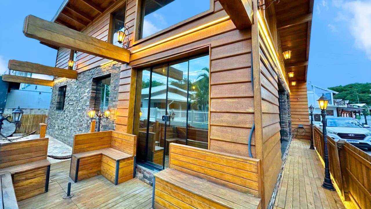 Uma área externa vista para o mar, é o local perfeito para se reunir com a família ao ar livre relaxar ao sol durante o dia e apreciar os magníficos pôr do sol à noite. Equipado com banquinhos e guarda sol, perfeito para curtir com a família e amigos.